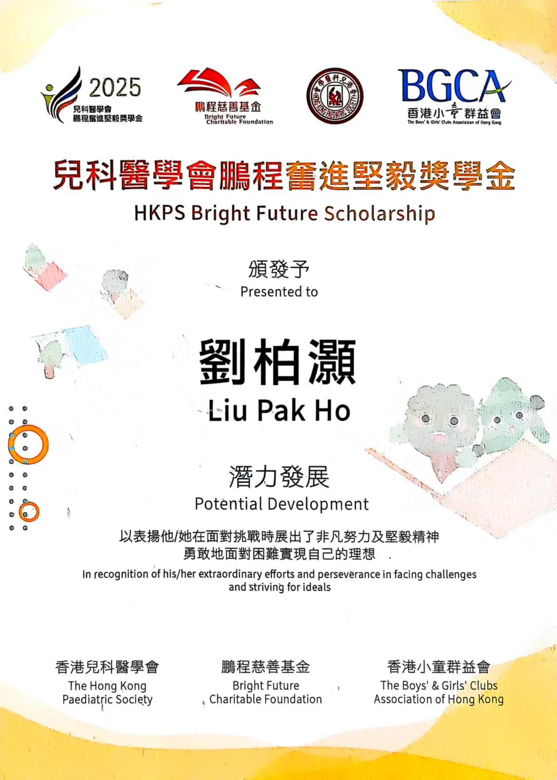 本校學生劉柏灝榮獲2025年度兒科醫學會鵬程奮進堅毅獎學金。兒科醫學會鵬程奮進堅毅獎學金旨在透過獎學金,鼓勵身處病患、特殊學習需要或來自基層的兒童及青少年,繼續以堅毅的精神克服自身困難,為自己未來繼續努力。再次恭喜得獎同學,期望劉柏灝同學未來能發揮所長,繼續向理想邁進。