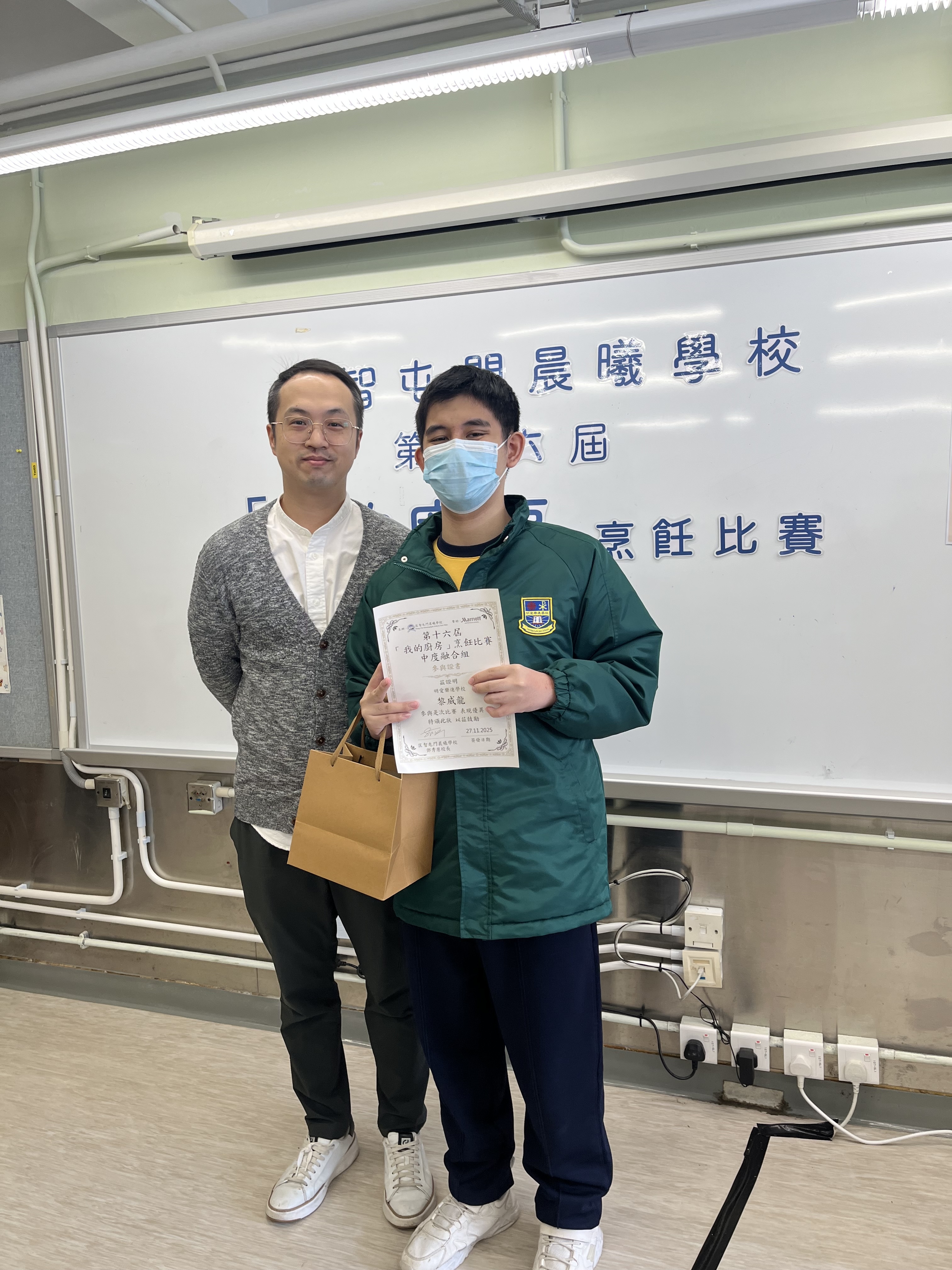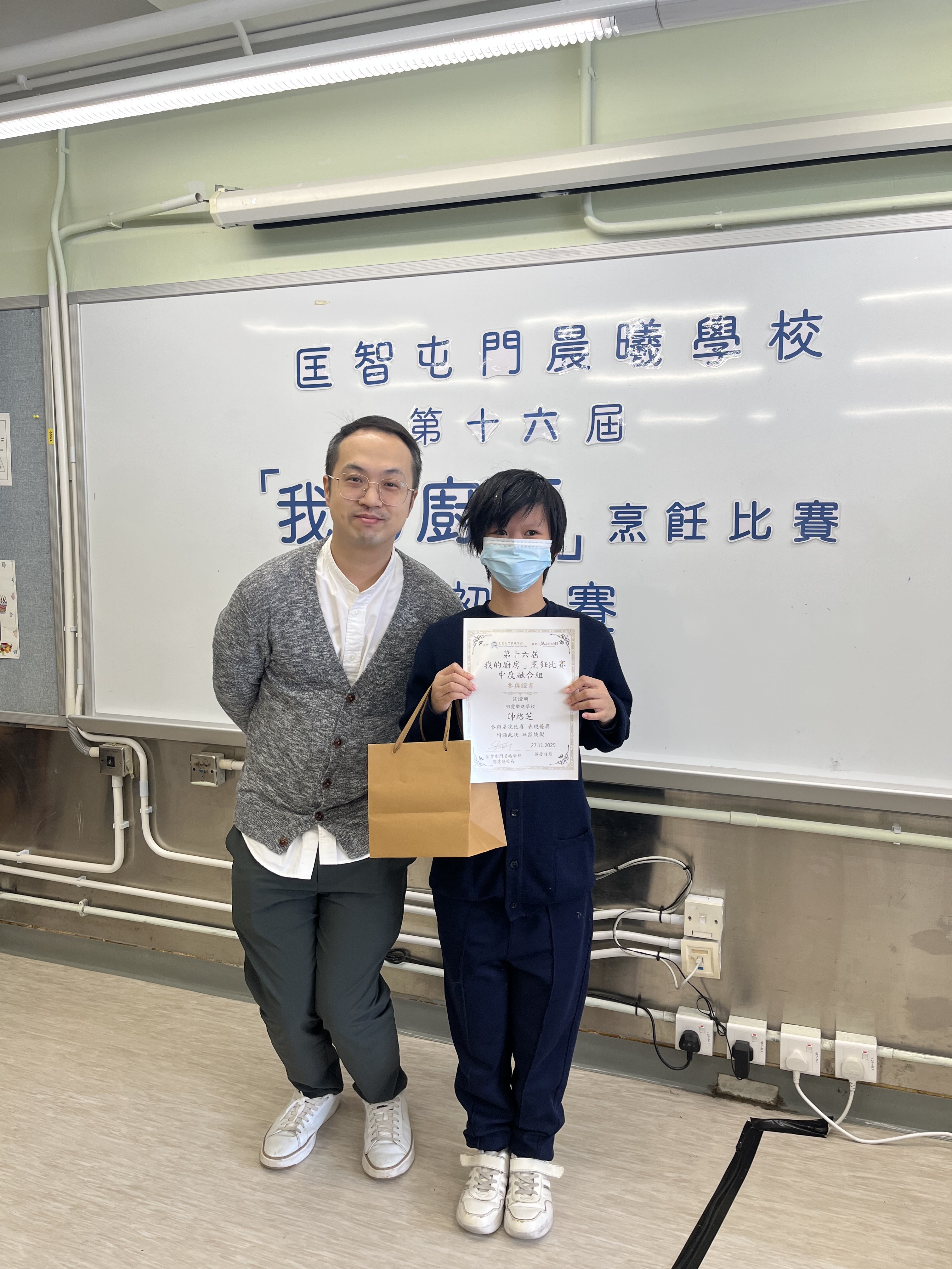 仁班黎威龍、誠班帥絡芝於2025年11月27日參與由匡智屯門晨曦學校舉辦的第十六屆我的廚房烹飪比賽。是次比賽以「瓜類」為題材。在比賽的過程中,學生能展現他們的烹飪才能,培養守法守規和自律盡責的精神,亦能從中觀摩其他學校的學生作品,學習欣賞別人的創作,獲益良多。
