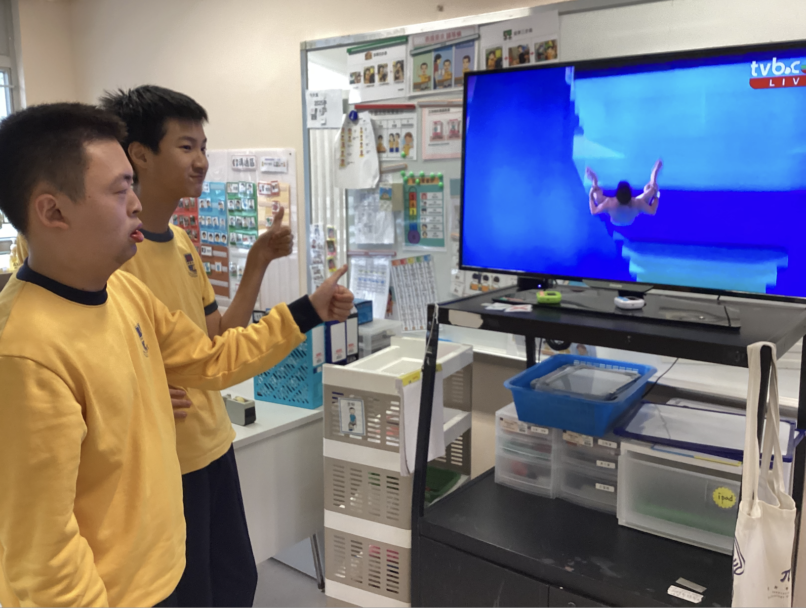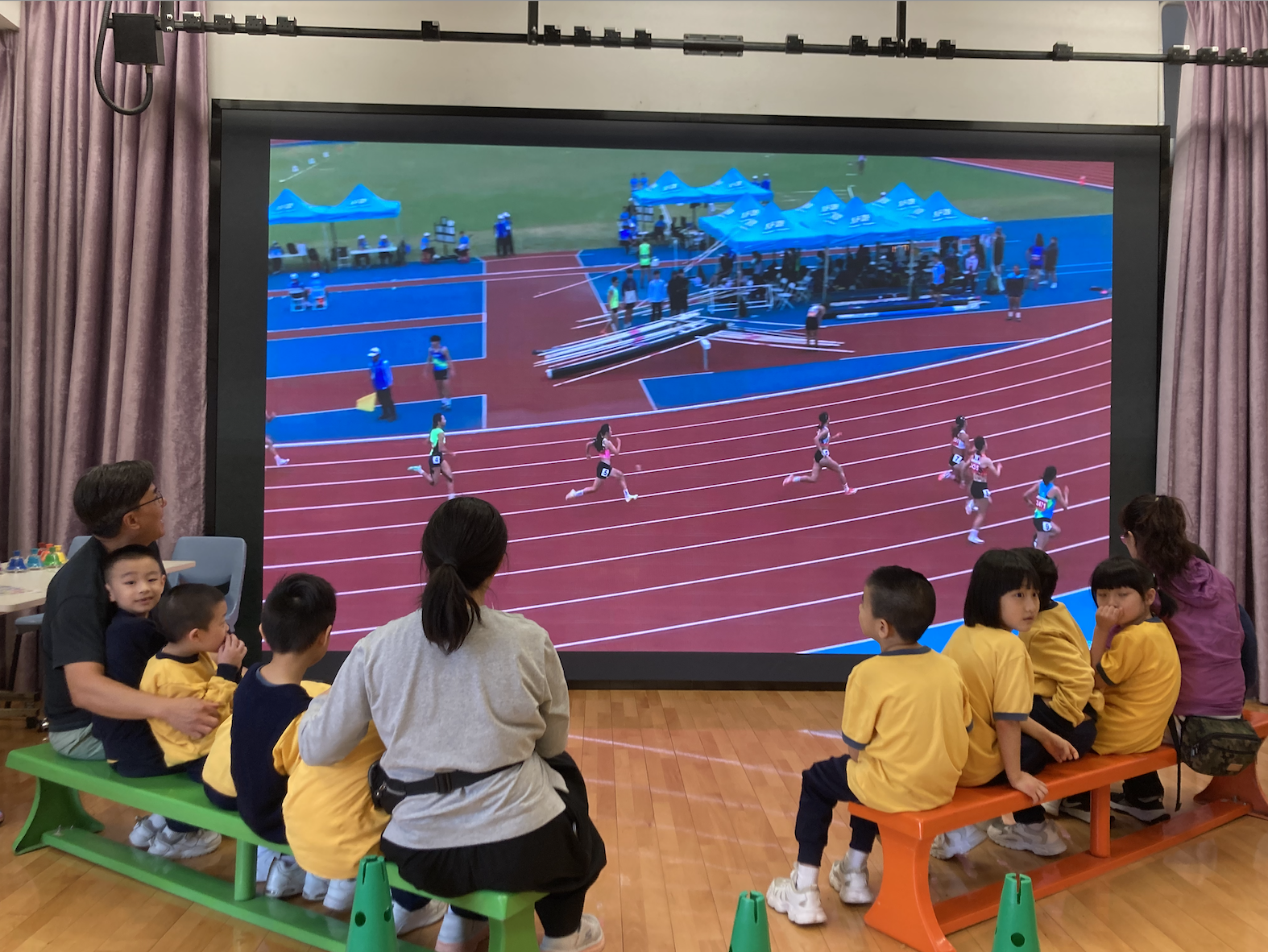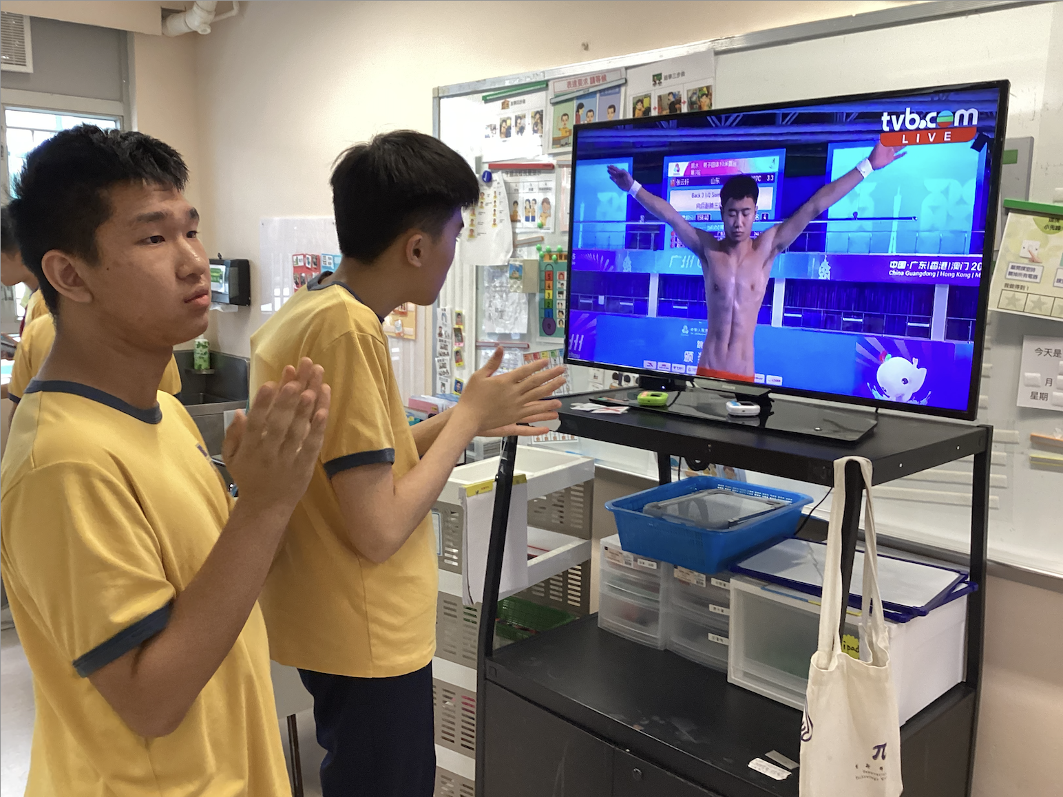 學校在不同時段播放全運會精彩比賽片段,如:小息、午休及體育課堂等,讓學生能欣觀賞全運會各項賽事,並在老師指導下從中學習。